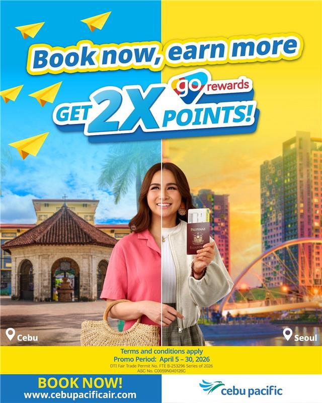 In line with Cebu Pacific’s 30th Anniversary, eligible passengers can earn Double Go Rewards points when they book flights directly on the Cebu Pacific website or mobile app during the promo period of April 5-30, 2026.